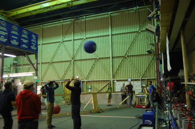After dinner, approximately 20 students worked with the mentors to list some possible designs and to plan out the next week's prototyping schedule. The group prioritized the prototyping of possible modules, specifically shooter designs and catching mechanisms, with design input from students and advice from our experienced mentors. They also discussed what field elements were most necessary for prototyping for the next few weeks and listed them as well. Finally, they discussed the mathematics and physics of shooting a 25-inch, compressible, bulky, and irregular projectile into a 3-foot goal. For example, mentors noted that we might as well design a robot to shoot from farther away from the goal, since the shallower angle of entry would give greater allowance for error. Mentor Paul Ventimiglia also determined that giving the large exercise ball some backspin helped in precision, though it also required more energy to apply both linear force and rotational torque.