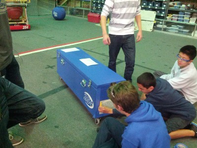After lunch, about 70 students congregated in the Bellarmine Robotics Lab to examine and better understand the team rules. In particular, they discussed the definitions of assist and possession and clarified the rules for such actions and others on the playing field. For the first two and a half hours, the group went through the relevant sections of the game manual and encouraged group discussion to find possible holes and list them to check with FIRST later. The group noticed some deviations in rules from previous years: the field is two feet narrower at 25 feet, and the match is 30 seconds longer. The autonomous period is five seconds shorter at 10 seconds, and the tele-operated period is 35 seconds longer at 2:20. Andrew Torrance noted the possible issues with battery life with the 25% longer match time. In addition to discussing rules, the team also formulated questions concerning the regulations to ask FIRST: