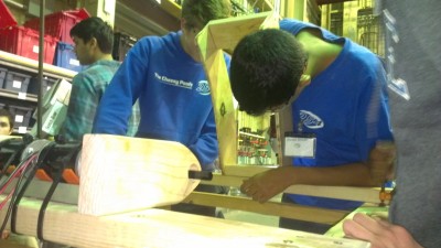 A team of students worked on the updated prototype of the flywheel shooter. The new prototype can shoot at an almost vertical angle, enabling the robot to toss the ball over the truss. It also allows for easier packing because its flywheel is smaller than that of the first prototype yet still retains the positives aspects of the original. Some problems occurred during the construction of the new wheel such as broken or splitting wood pieces delaying completion.