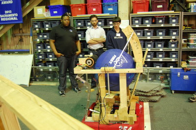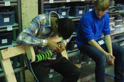 Tonight, we mainly focused on the building a preliminary goal with which to prototype before the field arrives and on prototyping and testing the effectiveness of a flywheel shooter and a slingshot shooter. Paul worked primarily with Godwin Vincent, James Holden, Jeremy Tanlimco, Vidur Maheshwari, Miggy Francisco, and Joncarlo Avila to design, sketch, and begin building a prototype for testing the effectiveness of a flywheel on such a large game object. They determined the best wheels with which to work based on their ability to grip the surface of the unusual game object. The prototype design was finalized and they plan to use four large wheels on the same axle hooked up to curved plywood "rims" to optimize the compression on the ball and somewhat minimize the size of the already bulky prototype. EJ Sabathia and Noah Marcel worked on the slingshot design, taping a 2013 Ultimate Ascent Frisbee to surgical tubing and hooking up the system to an alliance wall. The ball consistently bounced about 1/3 of the way down the court, given about 4 or 5 feet of backward stretch.