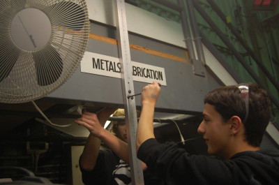 Today, students worked on organizing the pit storage shelves. Prior to today's work, the shelf storage had been bound by tape, but now, the tape has been replaced with Velcro straps and certain beams were marked to point to the holes used in assembly. This will help save time during pit set up and tear down and prevent us from having to keep reusing expensive tape to simply bundle the segments together.