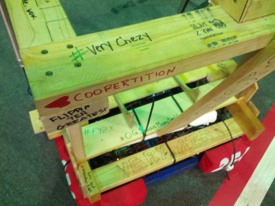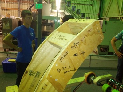 Instead of a normal blog post, have some pictures of the latest prototype (sponsored by Tem 254: Teh Chezy Pofs). As you can see, the students decorated the robot.